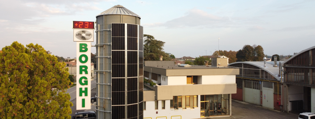 SiloSolare è l'innovativa struttura Borghi per il supporto di pannelli fotovoltaici. Pensata appositamente per gli impianti di stoccaggio permette di sfruttare la superficie laterale di silo nuovi o esistenti per la produzione di energia elettrica. SiloSolare può reggere qualsiasi tipo di pannello fotovoltaico e si può applicare a qualsiasi tipo di silo con fondazione in cemento.